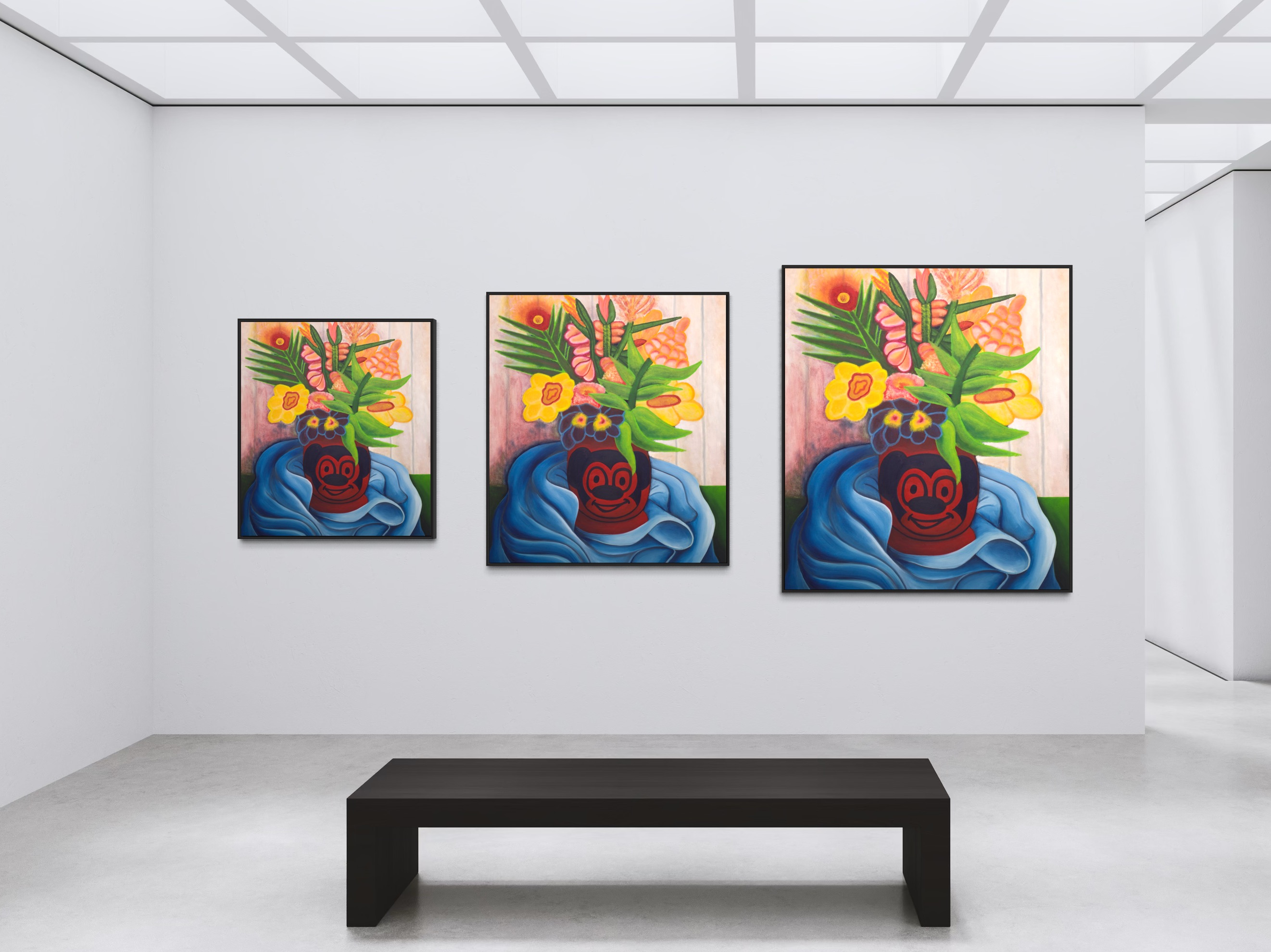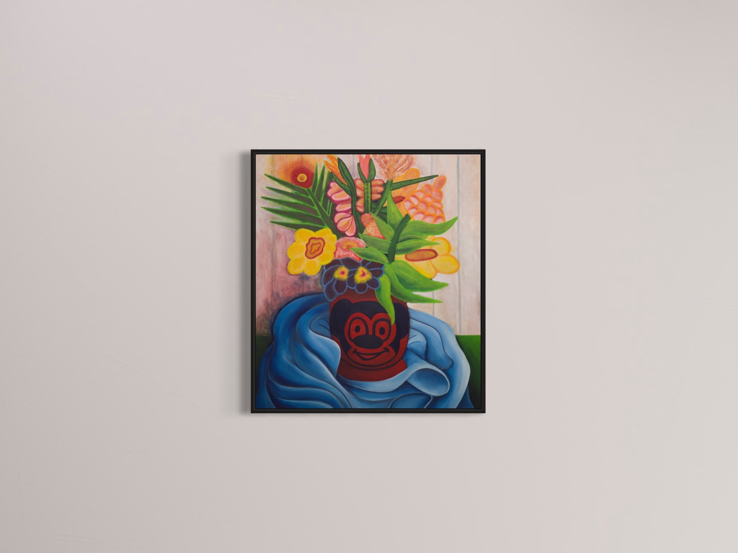 At first encounter, the piece feels like a dreamlike collision of pop culture and still life tradition. The oversized blossoms, rendered in vivid yellows, greens, and pinks, rise with theatrical energy, while the vase—bearing a mischievous grin—grounds the work in a subversive, almost totemic presence. Maupin blurs the line between innocence and irony, creating an image that is both celebratory and quietly provocative.